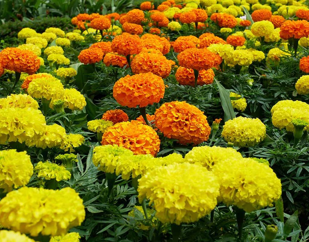 - French Marigolds (Tagetes patula): Compact, bushy plants with small, densely packed flowers; ideal for borders and containers.